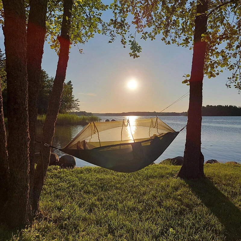A lightweight traditional hammock made of parachute fabric. There is a mosquito net with zipper opening to keep the bugs out. The mosquito net is supported by two strings.