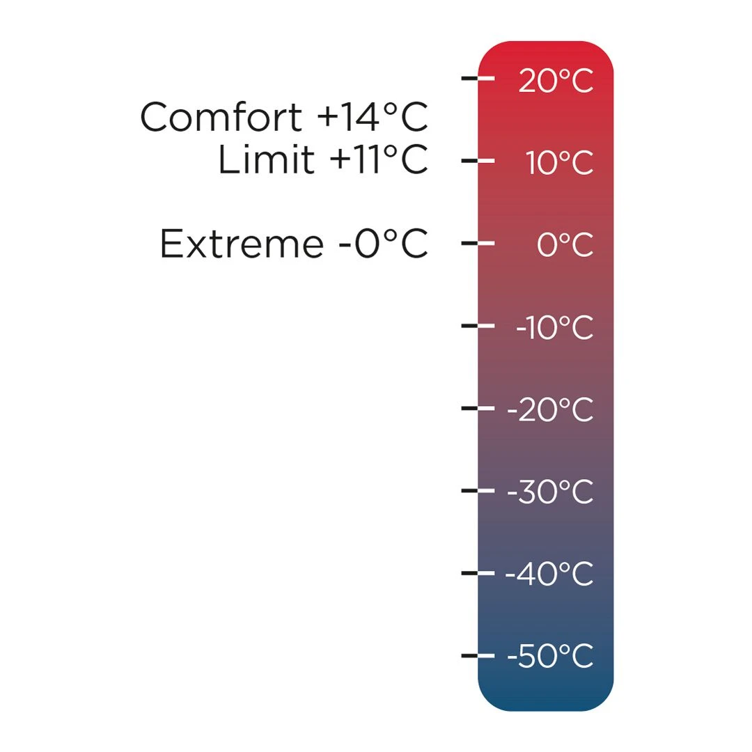 - Warmth: Comfort +14C, Limit +11C, Extreme -0C